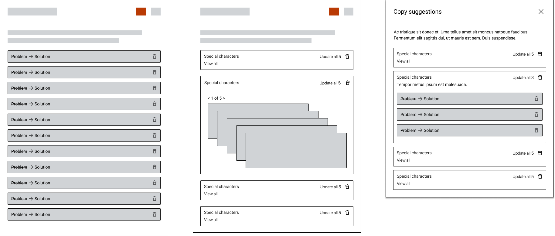 Next, I designed an interaction model to help users manage changes after they received guidance. I explored several options to ensure accessibility and usability, ultimately choosing a simple inline card for individual changes and a panel for bulk changes.